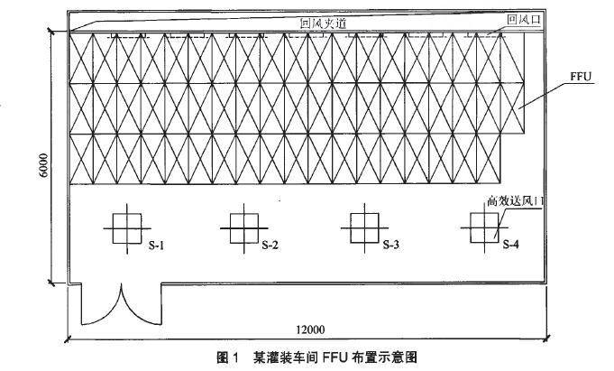 目前,許多醫(yī)藥工程設(shè)計(jì)人員采用FFU的組合來滿足局部區(qū)域的百級要求(布置見圖1所示)。由于工程設(shè)計(jì)者對FFU層流罩了解不夠,考慮不全面,在設(shè)計(jì)過程中產(chǎn)生了如下一些問題: