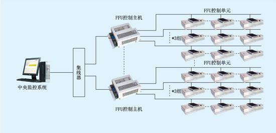 人機界面主機,采用顯示屏實現遠距離對FFU的監控和調節。能夠方便的實現FFU多臺及分區控制。能夠實現任意臺數FFU的啟停和調速功能,調速功能能夠實現數字化,即直接輸入預期的風速值(如:10%.20%等),以達到調速的目的。能夠對任意一臺FFU的電流進行監測。當有故障FFU報警時,能實時地顯示故障FFU所在位置。計算機監控中心,采用現場界面方式,通過與監控主機的通訊,當有任何一臺或多臺FFU發生故障時,計算機監控中心現場界面報警,迅速確定故障FFU所在部位,確保監控人員及時處理故障。